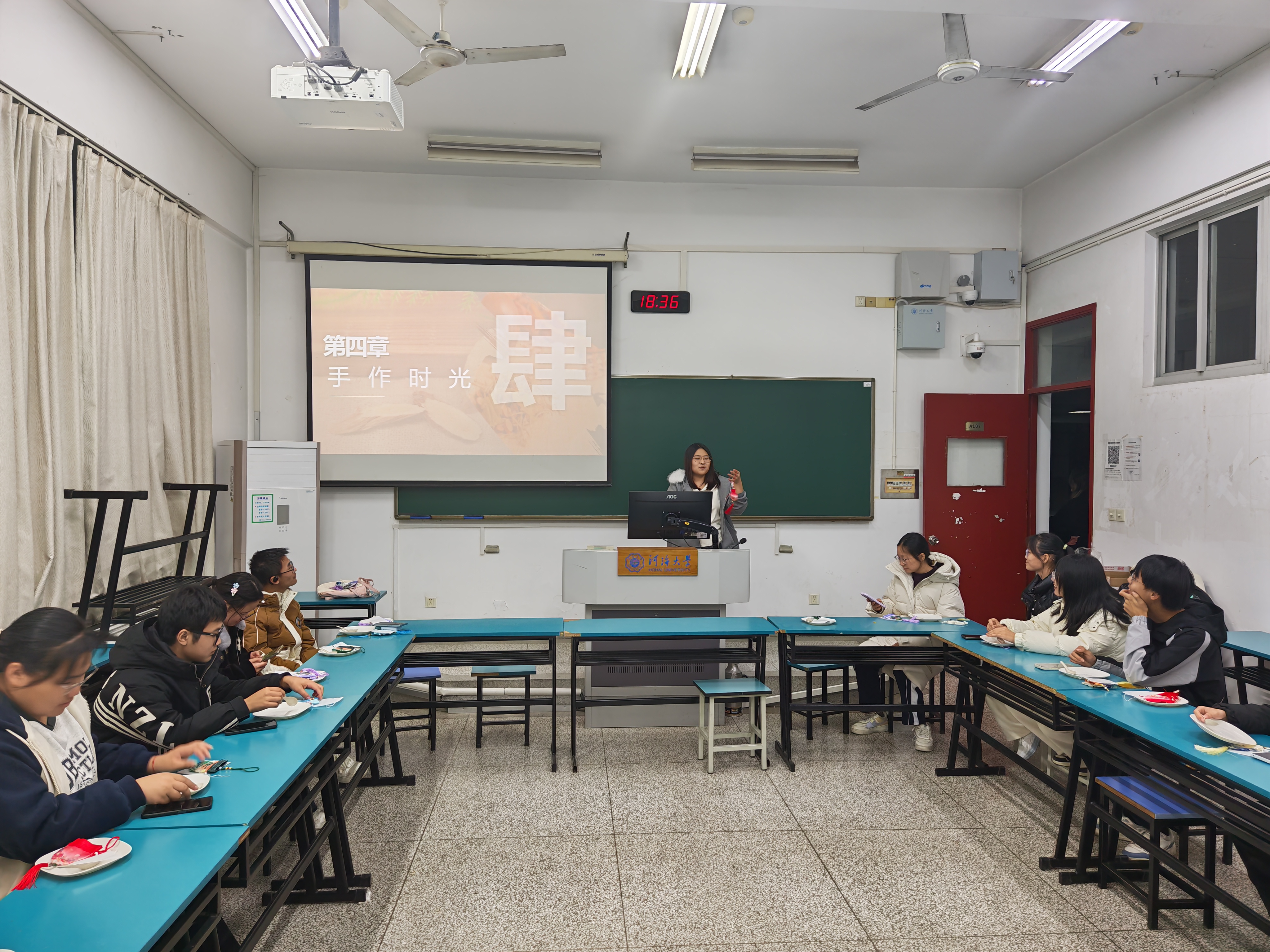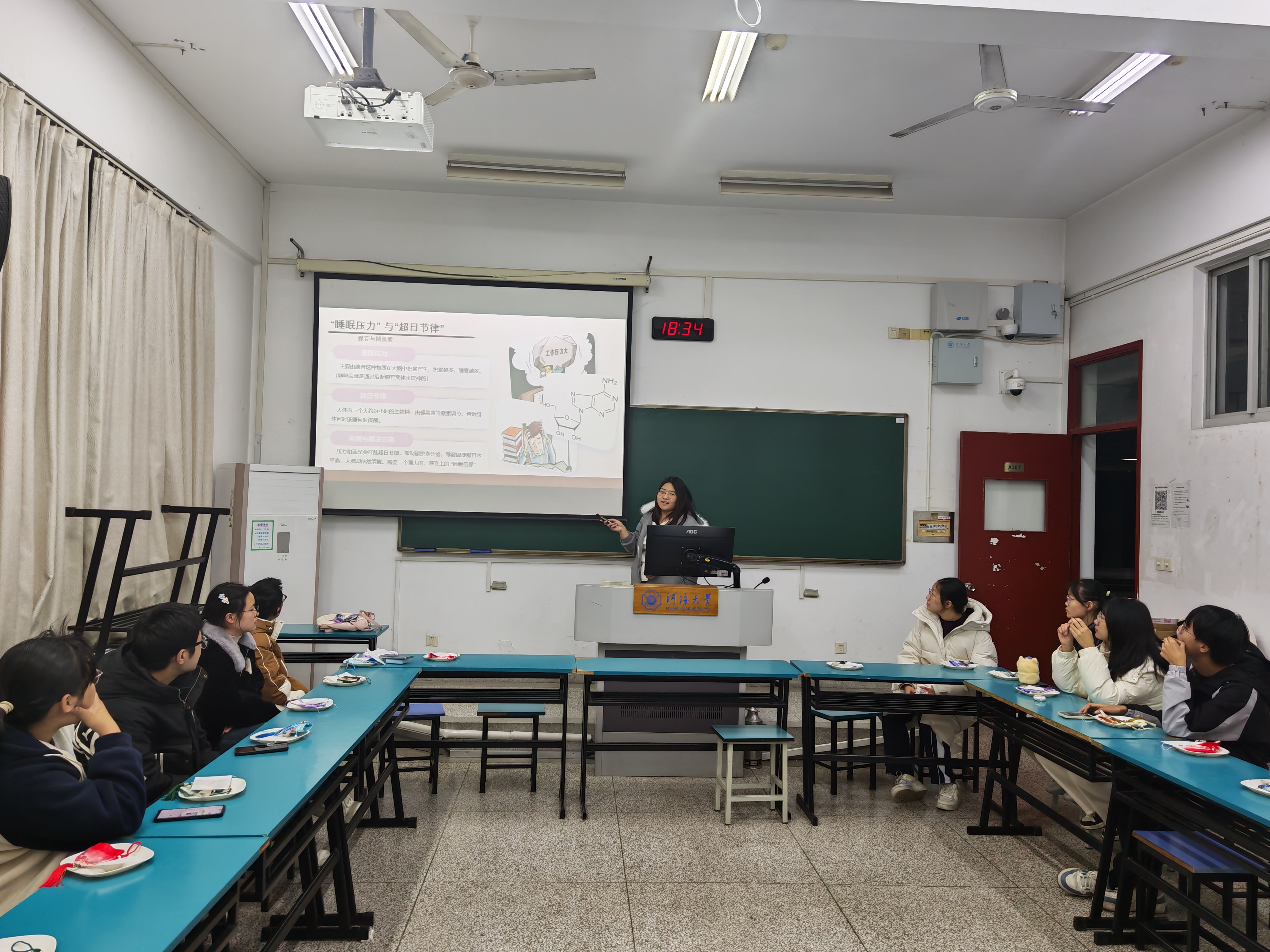 活动由毕嘉爽同学主持。她从当前普遍存在的睡眠困境出发,介绍了“睡眠压力”与“超日节律”等概念,并引导大家学习运用正念疗法缓解压力。她指出,本次香囊制作不仅是一次手工体验,也是一次践行正念的心灵疗愈过程。