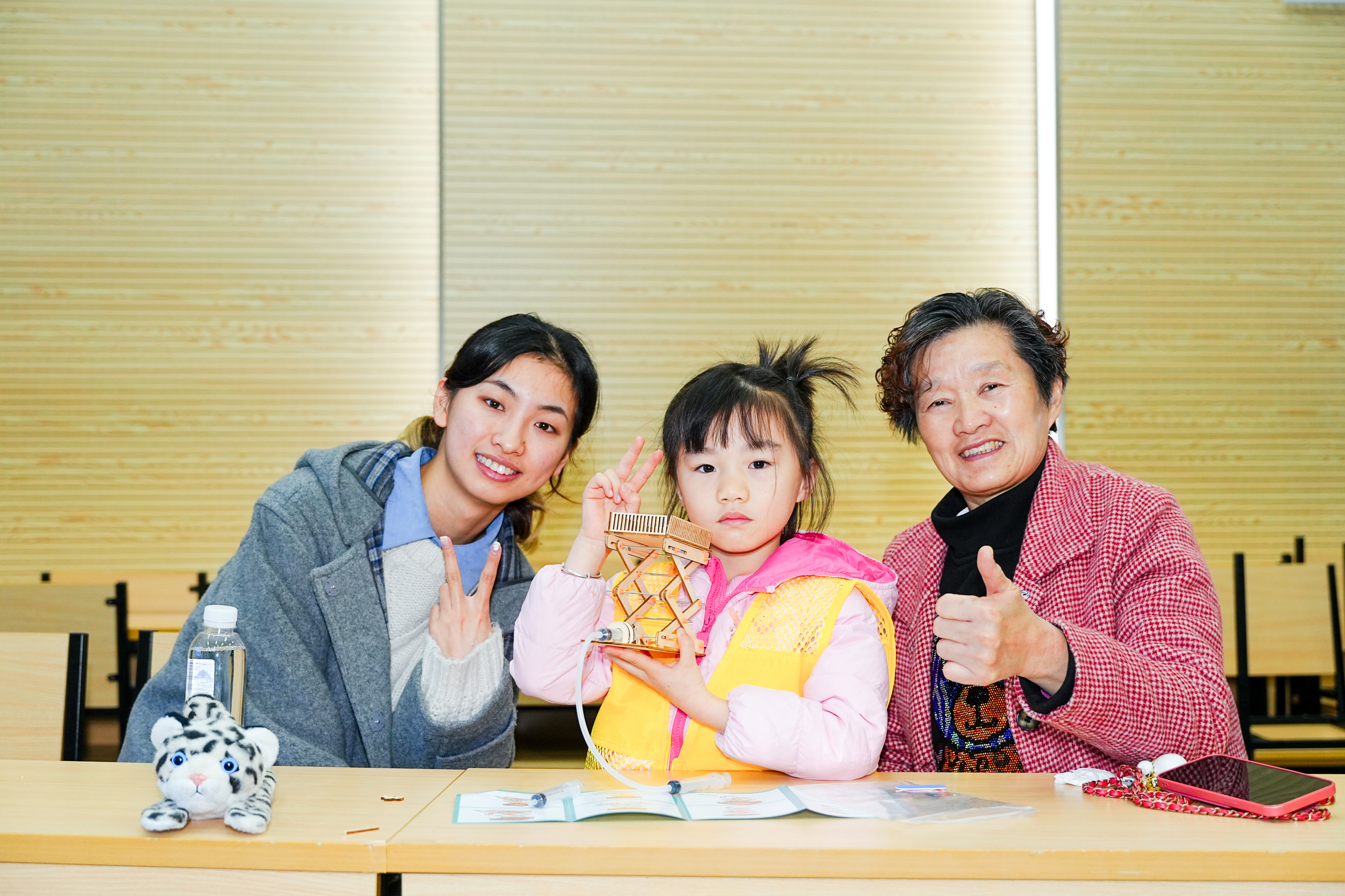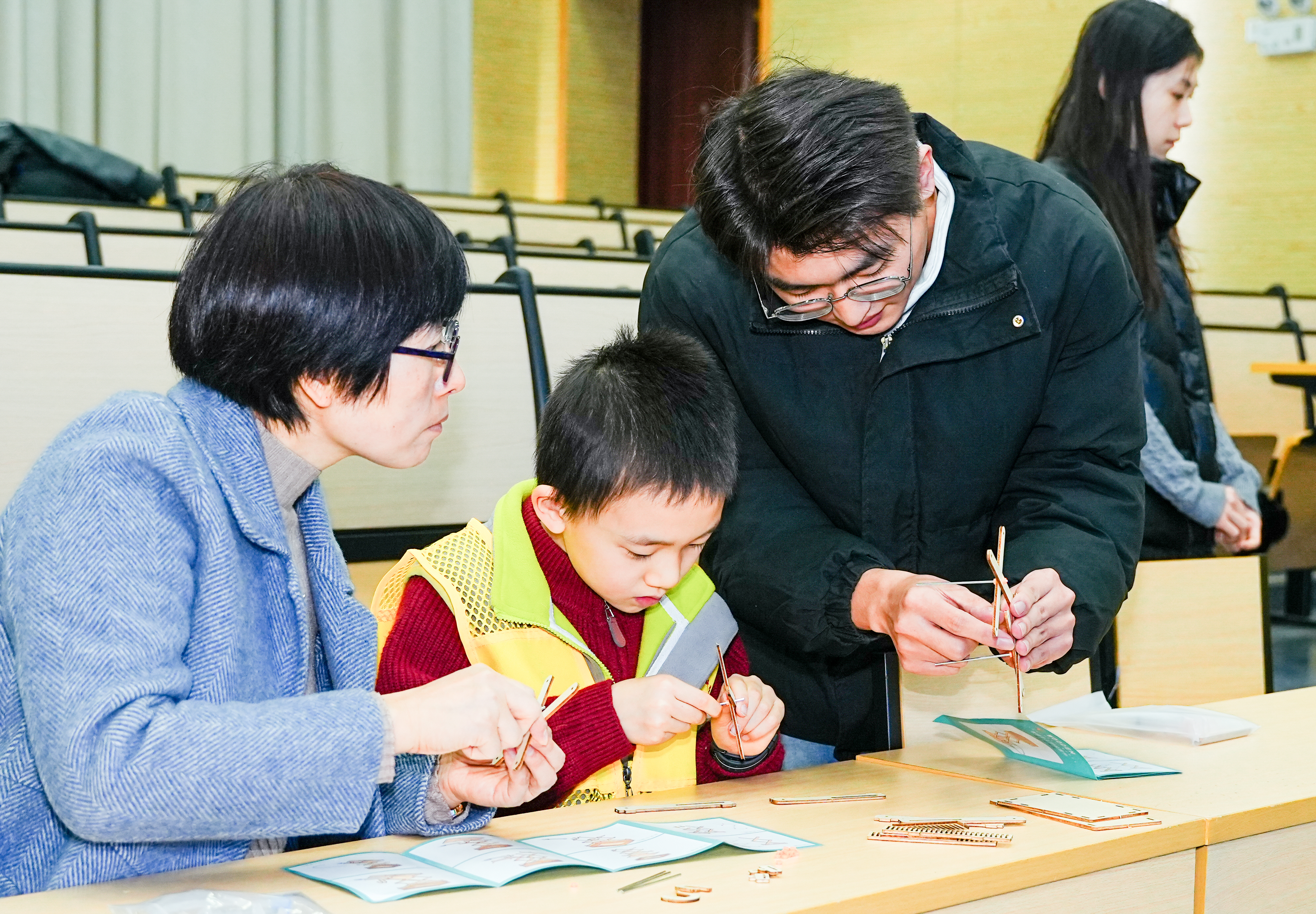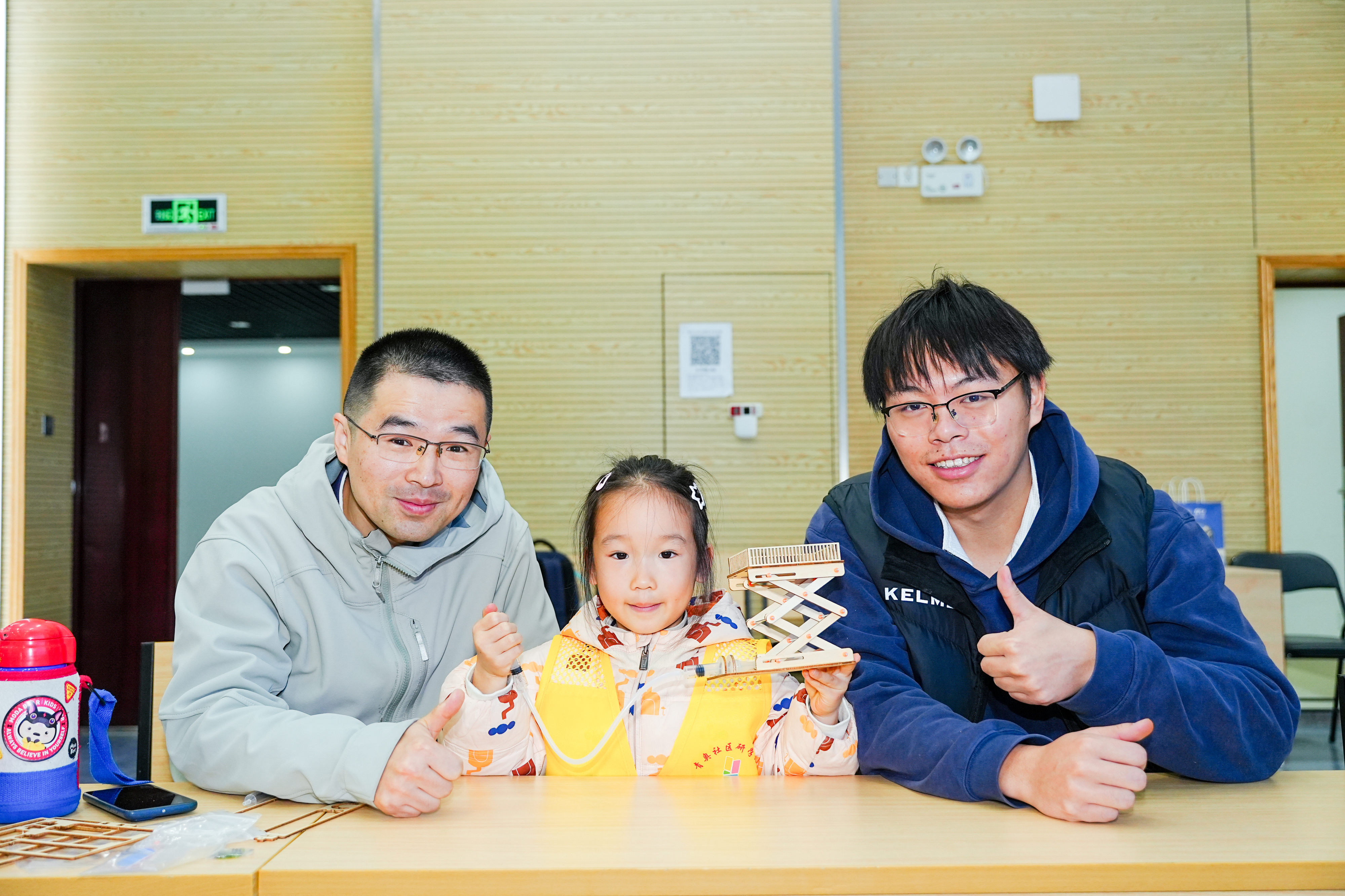 在“亲子协力制作液压升降机”实践环节中,学生党员提前备齐制作材料与操作指南,现场耐心指导每组家庭分工协作:孩子们积极辨认零件,家长们协助拼接支架;每当遇到组装难题,学生党员便及时上前答疑解惑,手把手指导大家调整液压装置。整个过程不仅锻炼了孩子们的动手能力与协作意识,更在亲子互动中传递出“实践出真知”的科学理念,充分彰显了学院以科普实践涵养科学素养的育人初心。