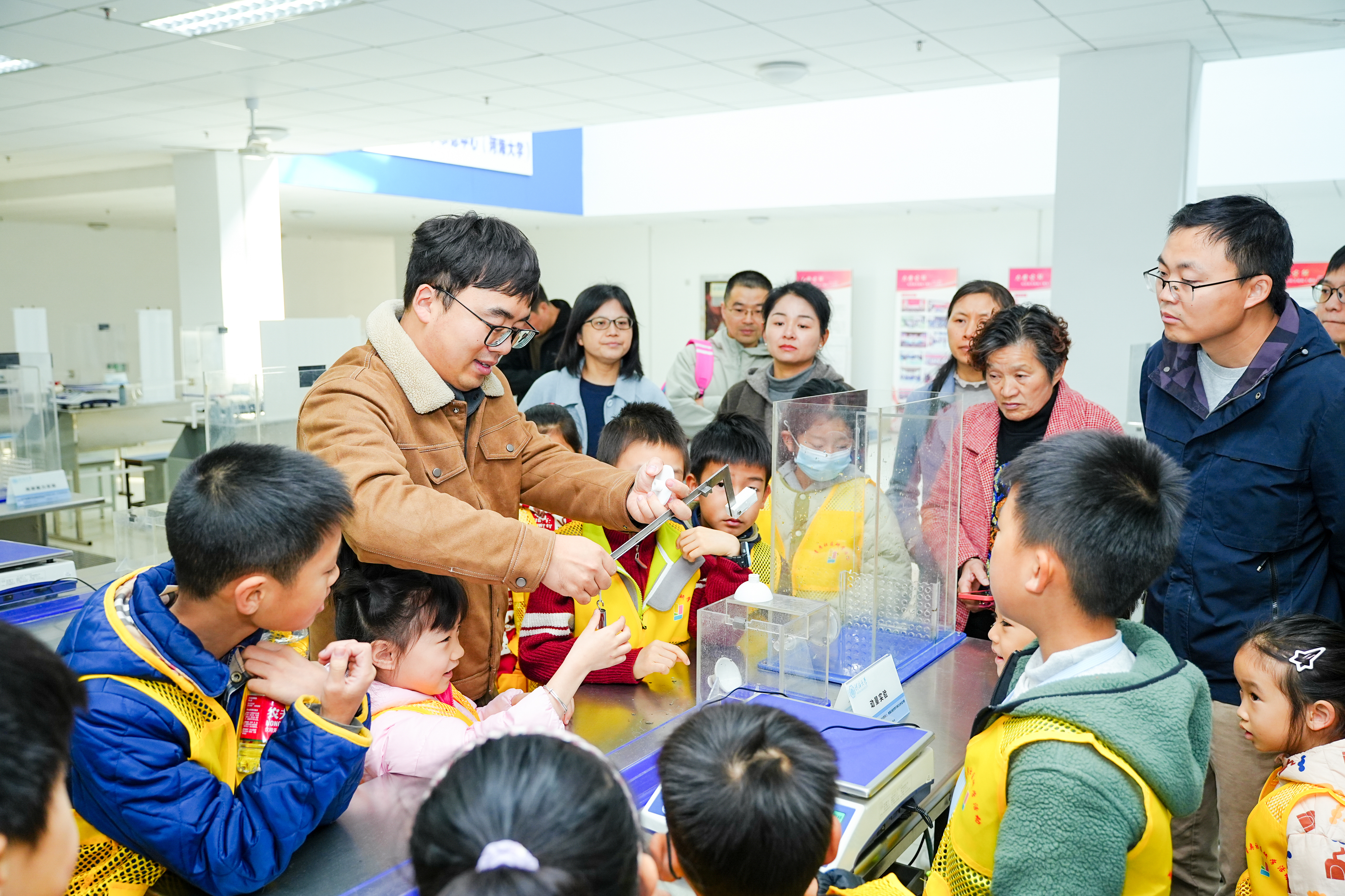 随后,在两支部党员教师与学生党员的引导下,亲子家庭走进力学国家级实验教学示范中心。水力学实验室内,动量实验装置、水流漩涡演示设备等迅速吸引了孩子们的目光。大家纷纷围拢在实验设备旁,聚精会神地观察水流的动态轨迹。党员教师结合实验现象,用通俗易懂的语言讲解力学原理,将抽象的物理知识转化为直观、生动的体验,不仅让孩子们在好奇与探索中感受到科学的魅力,也让家长们重温了科学知识的乐趣。