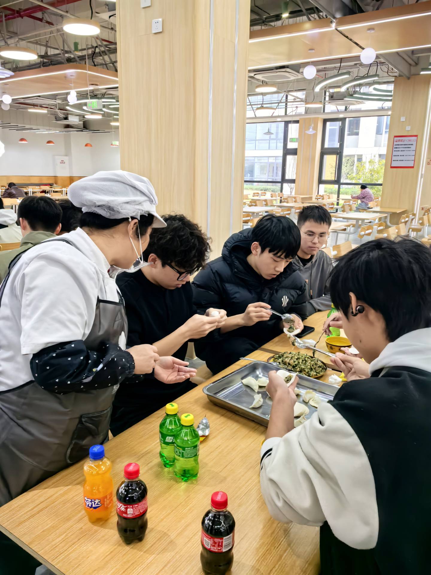 活动现场暖意融融,雪白的面皮、鲜香的馅料整齐摆放,节日氛围十足。食堂阿姨们手把手教同学们擀皮、包馅的技巧,大家围坐桌前一边忙活一边畅谈家乡冬至习俗,将节日的暖意与同窗的情谊包进一个个饱满的饺子里。