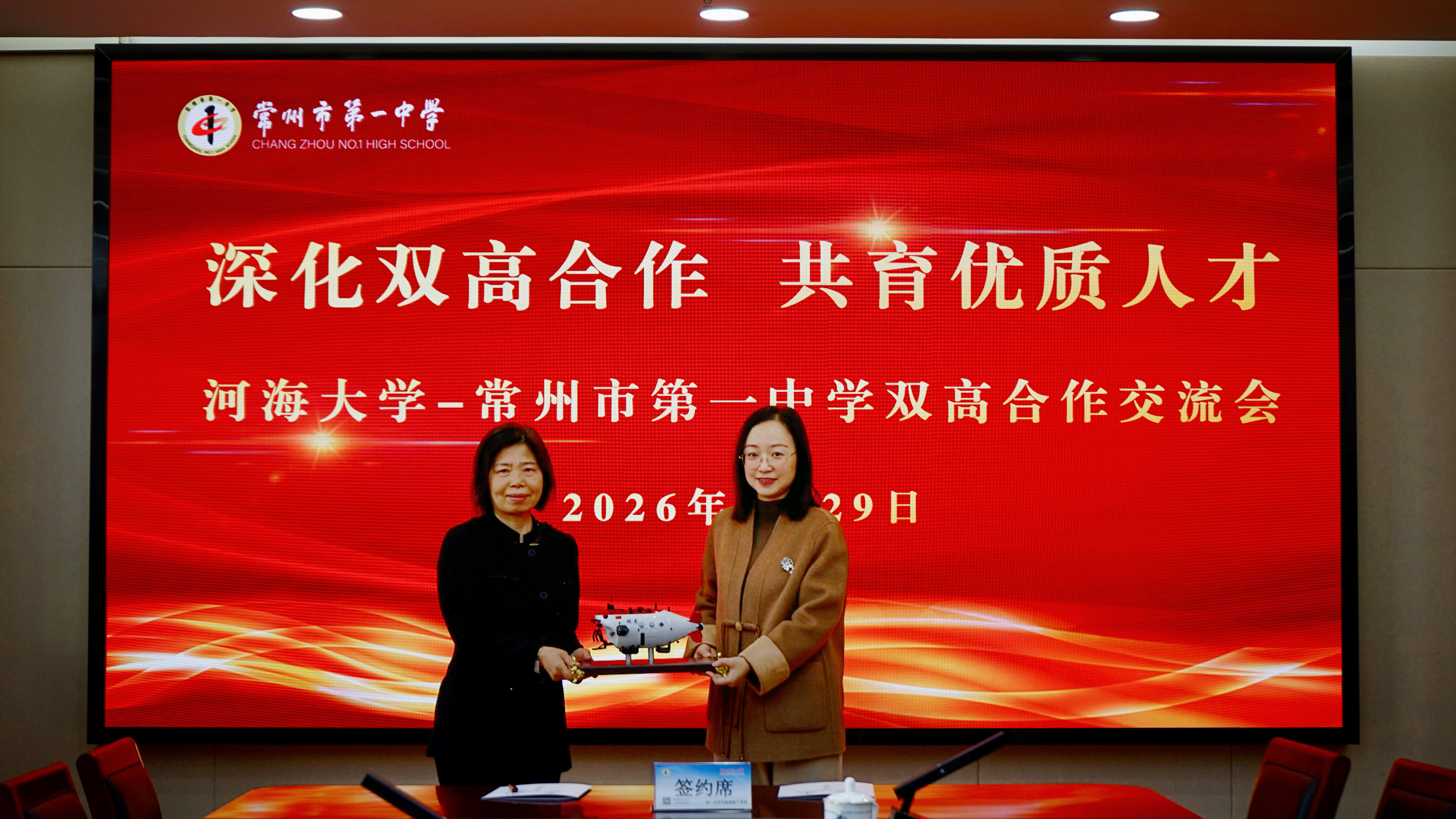 孟新副书记代表伟德victor1946,对常州市第一中学长期以来为学校输送大批高素质优质生源表示衷心感谢。她强调,伟德victor1946作为国家“双一流”建设高校,始终坚守“立德树人”根本任务,此次“双高共建”是学校延伸育人链条、履行社会责任的重要举措。未来,学校将充分发挥在学科、科研、师资等方面的优势,为一中学子靠前提供优质课程资源、科研实践平台、生涯规划指导、学术交流机会等全方位支持,助力青少年早立志、立大志,成长为适应国家重大战略需求的栋梁之才。活动现场,孟新副书记代表学校向一中赠送凝聚河海科研成果的“蛟龙号”模型,寓意祝愿一中学子如深海探索者般,笃行求真、勇攀科学高峰。